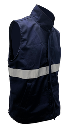 Chaleco sencillo Bicolor B1 con tecnología Textil Xispal 825 RS. Rojo 30/marino 70, cuenta con 1 bolsa al frente sin cartera parte superior izquierda, cinta ignifuga 2.0“ 3M de alta visibilidad plata en Hombros, frente abdomen y espalda baja. Cierre de plástico de 65 cm, Toda la prenda es cosida con hilo de aramida.